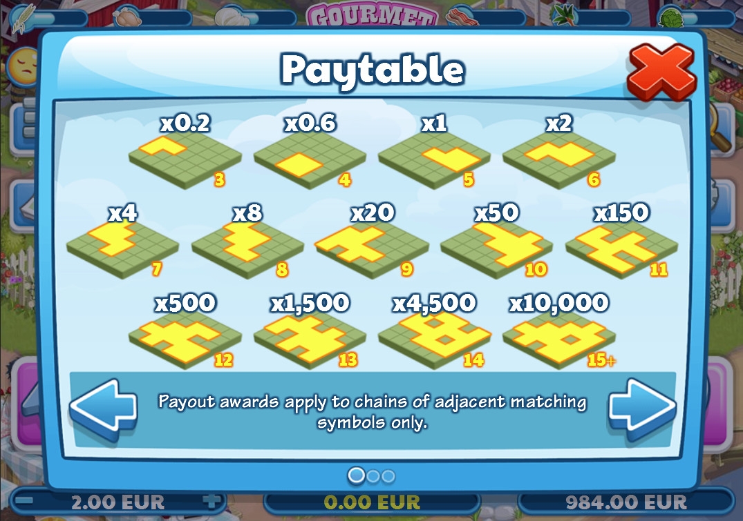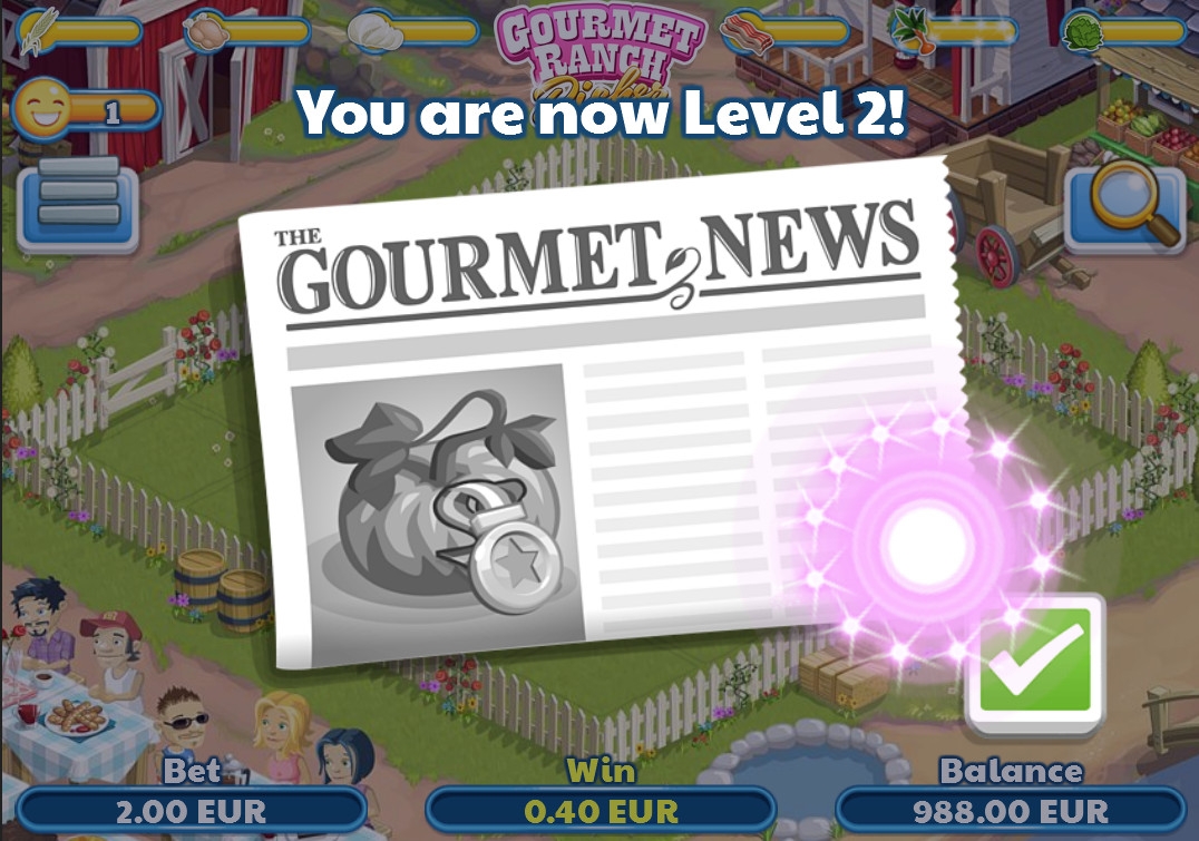 В названии модели не зря упоминаются гурманы. Из собранного урожая готовятся многочисленные блюда. Они открывают доступ к новым шаблонам формирования комбинаций. Кроме того, в верхней части экрана есть изображения используемых символов с ползунками, которые заполняются при образовании цепочек. Когда все они будут полны, клиент перейдет на новый уровень с дополнительными ингредиентами и более выгодными условиями игры.