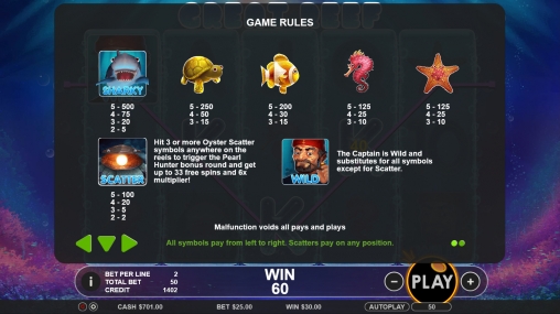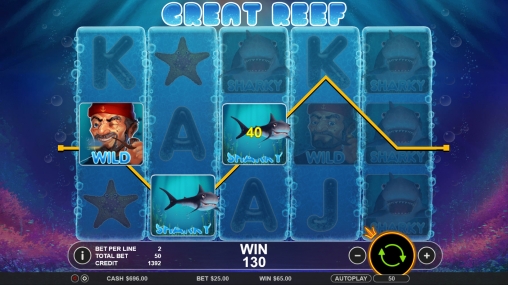 Great Reef – это 5-барабанный автомат с двадцатью пятью всегда активными линиями для формирования комбинаций. На его экране можно увидеть сразу пятнадцать картинок. Набор опций состоит из разных типов символов и бесплатных спинов с увеличенными коэффициентами расчета выигрышей.