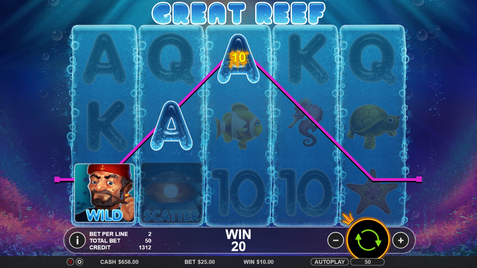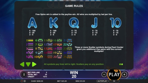 Размер выплаты определяется умножением ставки по линии на коэффициент полученной комбинации. Он бывает в Great Reef от х2 до х500. Если последовательностей несколько по разным полосам, деньги суммируются.
