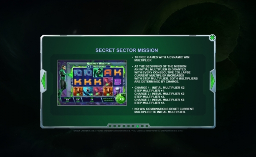 Подборка доступных в аппарате функций вызывает особый интерес. Кроме базовых символов, здесь предлагаются несколько видов специальных картинок, система Collapsing Feature со шкалой Green Lantern Power Bar, бонусы Fear Fight Mission, Training Center Mission и Secret Sector Mission, а также четыре прогрессивных джекпота Playtech.