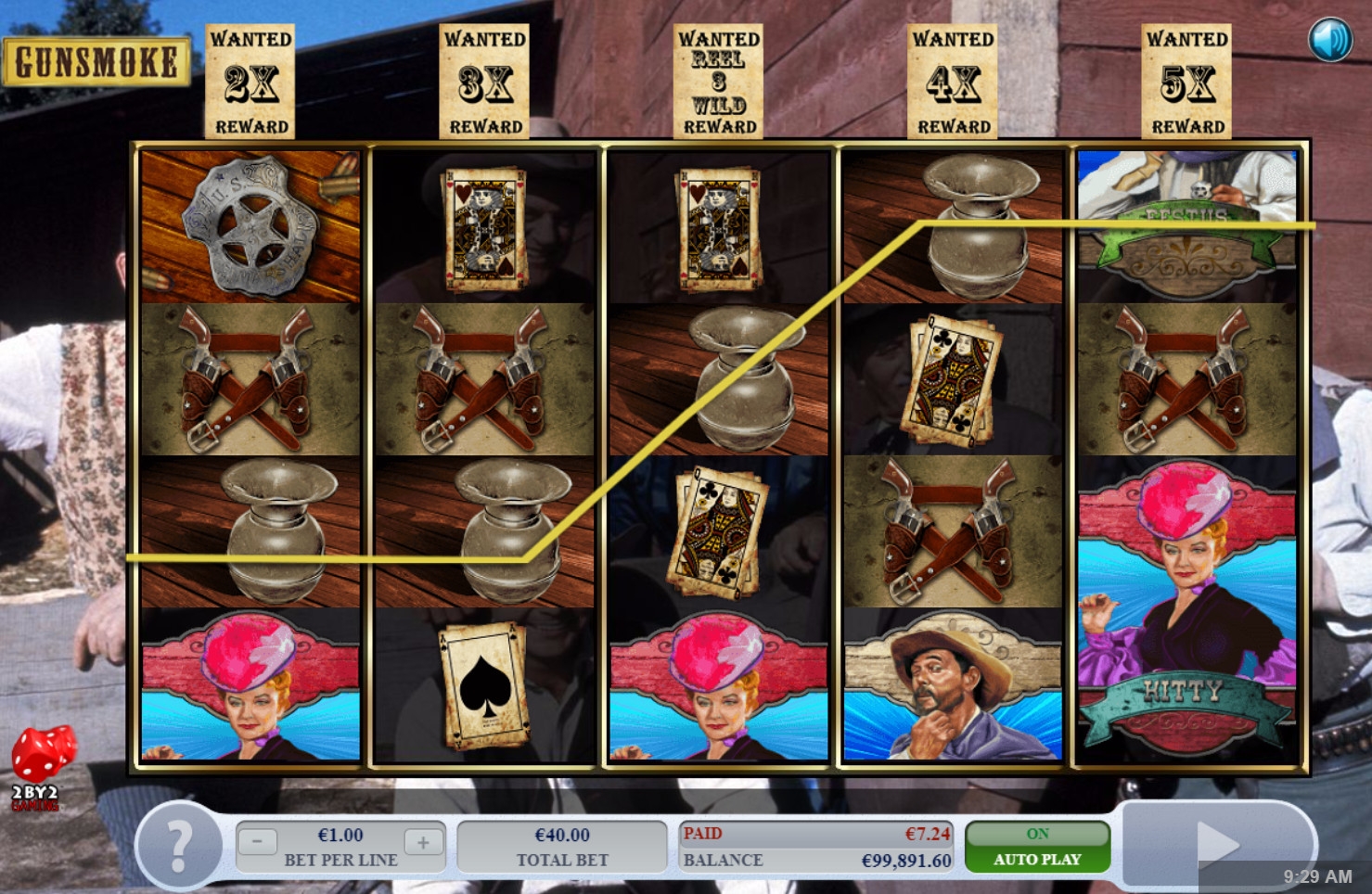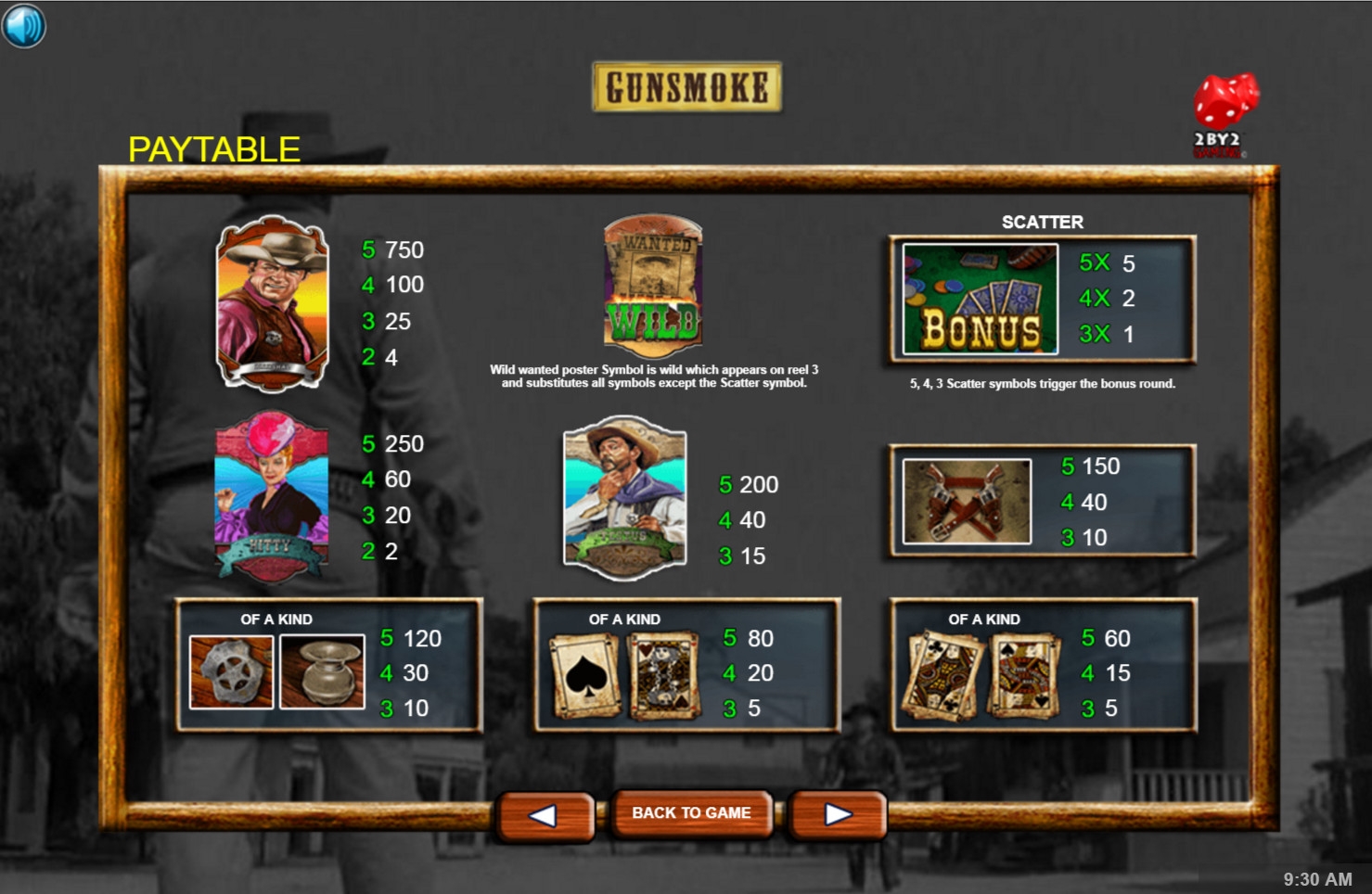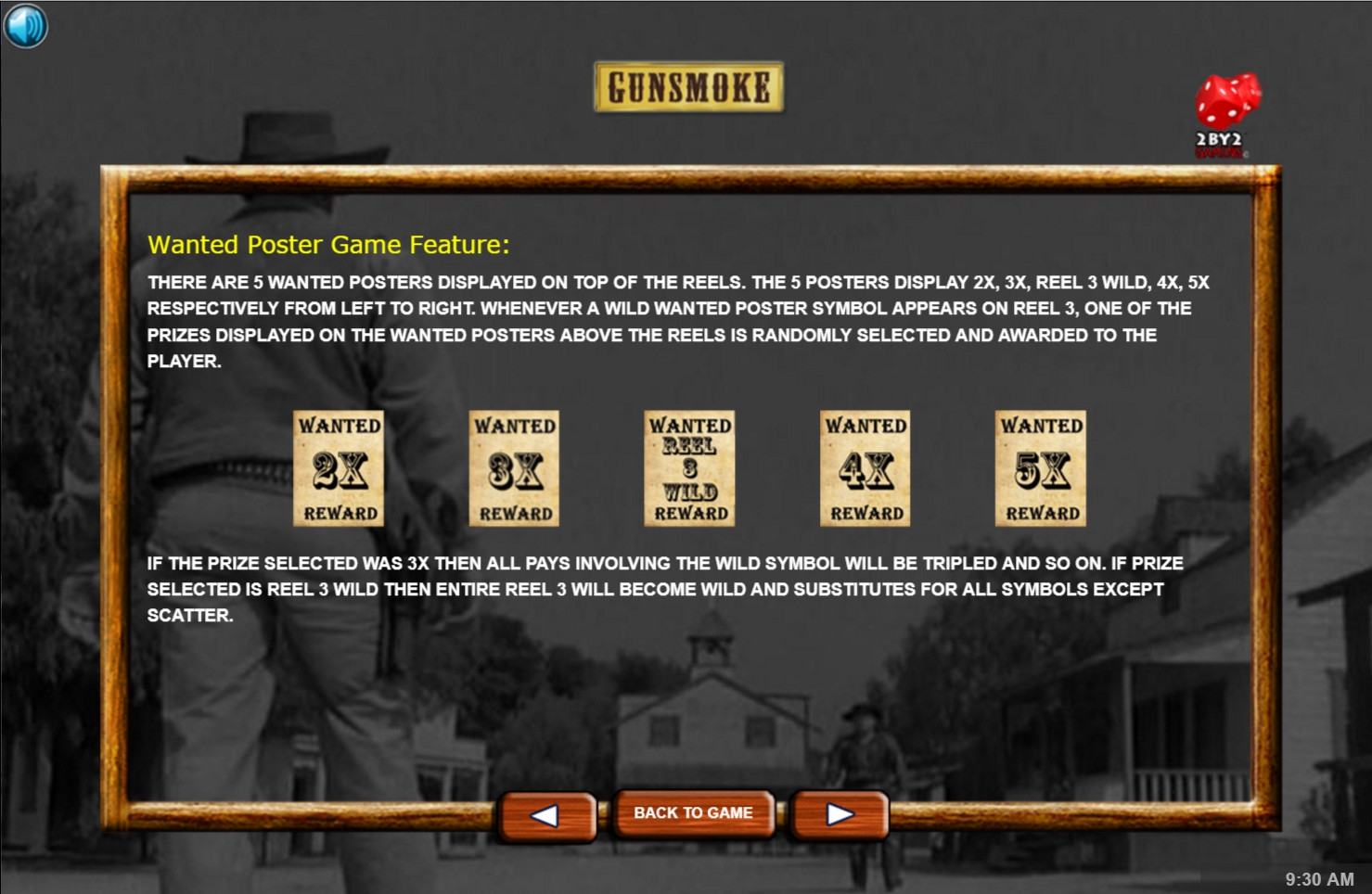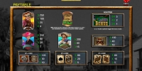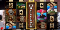 - Wild (плакат о розыске преступника) есть только на третьем барабане. Он заменяет другие картинки, кроме бонусной, а также используется в призовых раундах.