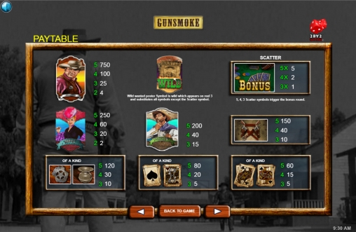 Аппарат предлагает разные виды картинок, включая несколько особых символов, тематические призовые раунды, бесплатные вращения и уникальные бонусные функции. Все они рассматриваются ниже, в специальных разделах обзора Gunsmoke.