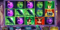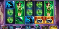 На экране слота появляются три молодых ведьмы в разноцветных нарядах. Каждая из них занимает сразу три ячейки по вертикали. Также на барабанах изображены бутылочки с магическими снадобьями, ворон, черный кот и свечка на черепе.