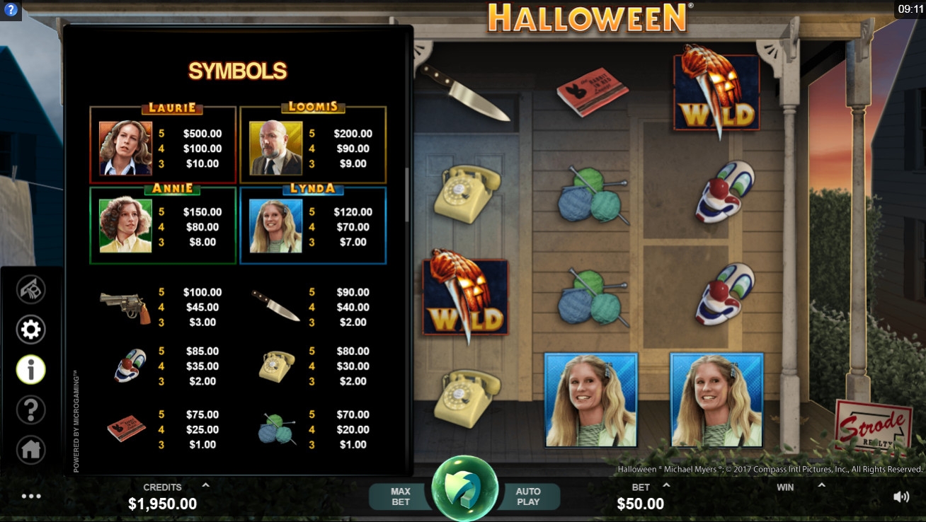 На барабанах видео-слота можно увидеть клубки ниток со спицами, маска клоуна, спички, дисковый телефон, кухонный нож, револьвер, а также герои фильма: Линда, Энни, Лори и Лумис.
