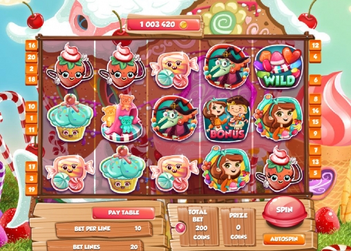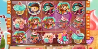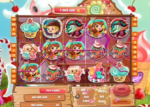 Веселый автомат сделали по мотивам сказки про семью людоедов, которые пожирали путников на торговом тракте. И главное все веселенькое такое, тортики какие-то и конфетки. Максимальная выплата не большая, за то дает на простых спинах, играть интересно.