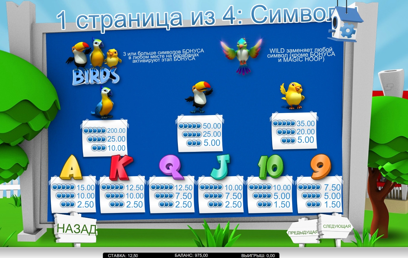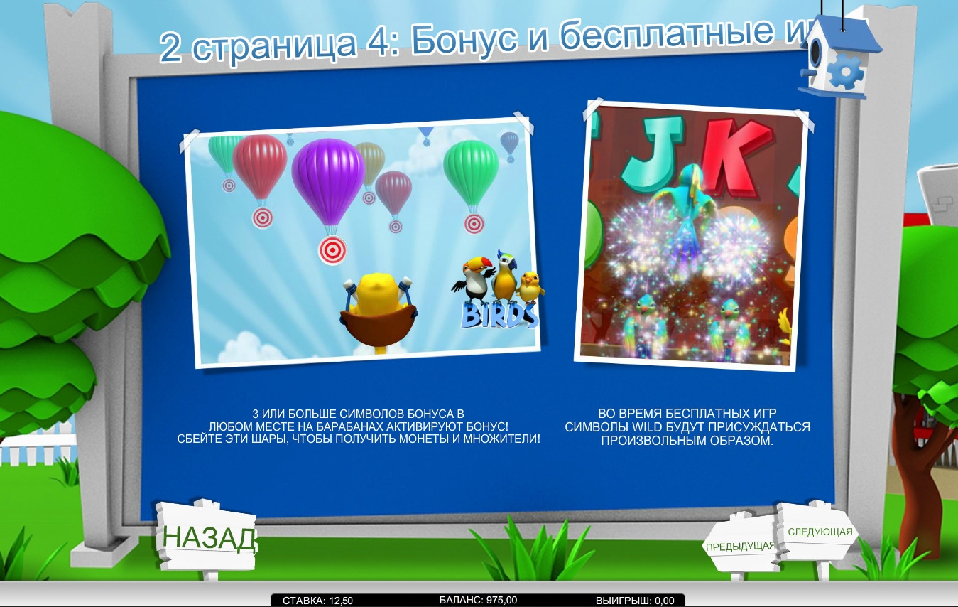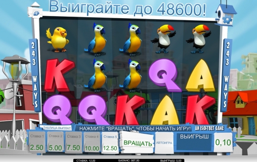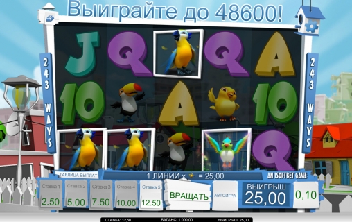 Этот бесплатный игровой автомат с красочными тропическими птицами и отличной трехмерной графикой. Здесь есть призовая игра, в которой можно пострелять из рогатки. Игра полностью переведена на русский язык.