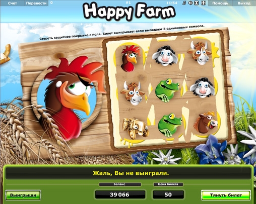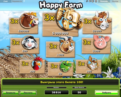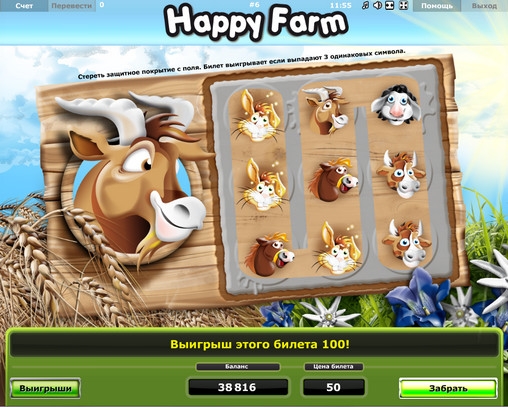 В игре Happy Farm нет ничего замысловатого. Она дает возможность быстро и в простой форме испытать удачу и претендовать на крупные выплаты. К тому же, модель русифицирована, что очень удобно. Также радует очень красочная 3D-графика. В общем, запускайте скрэтч-карту Happy Farm, и сами все увидите.