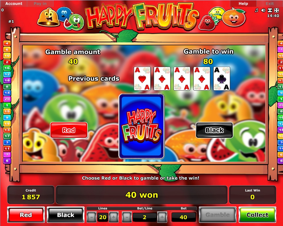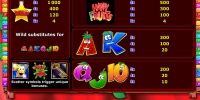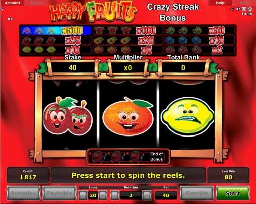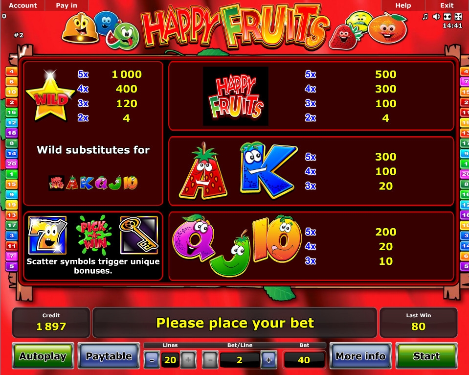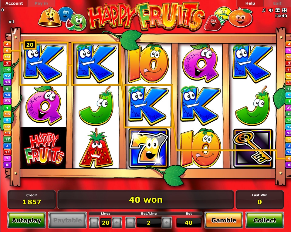В Happy Fruits пять барабанов, двадцать линий и три ряда картинок. Модель предлагает особые символы, несколько бонусных раундов и игру по шансам.