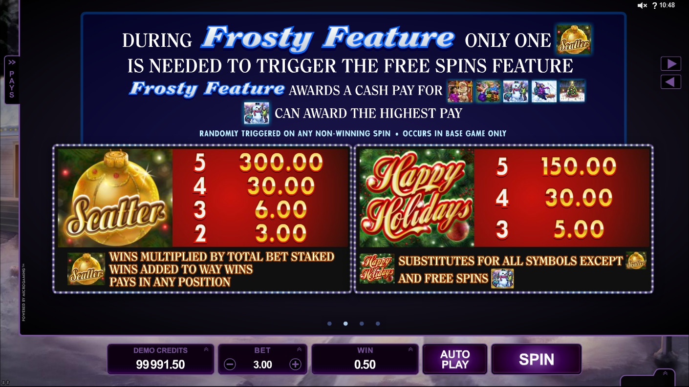В Happy Holidays есть призовой раунд Frosty Feature, который может запуститься в любом базовом спине. Пользователь получит бонусную выплату, а также получит шанс стать участником фри-спинов при наличии на экране всего одного скаттера. Детали уточняйте в справочном разделе.
