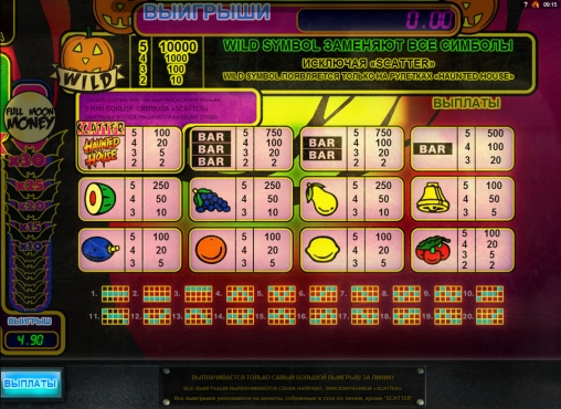 В Haunted House двадцать линий, пять барабанов и пятнадцать изображений на основном экране. Все активные полосы задействованы по умолчанию. Ставки по ним всегда равны. Диапазон по каждой позиции: от одного цента до одного доллара. Так что на спин принимается не менее двадцати центов и не более двадцати долларов.