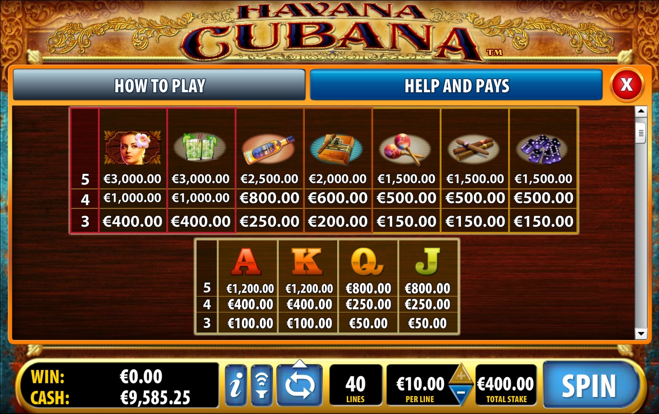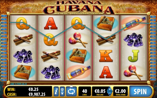 Havana Cubana – пятибарабанная модель, играть на которой можно только по сорока линиям. Ставка на каждую из них выбирается пользователем из диапазона от одного цента до десяти евро. Таким образом, на спин принимается не более четырехсот евро.
