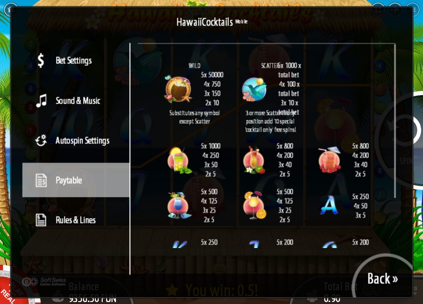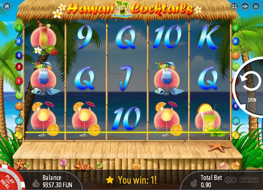Играть на игровом автомате Hawaii Cocktails можно по одной – девяти активным линиям. Ставка на линию может быть от десяти центов до одного кредита в выбранной валюте. Таким образом, больше девяти кредитов на спин поставить нельзя.