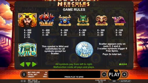 Ставки по данным полосам неизменно равны: до десяти монет на каждую. Номинал чипов пользователь выбирает из предлагаемого диапазона. Уточнять его следует в казино, где вы собираетесь играть. В официальной демо-версии автомата Hercules Son of Zeus монеты стоят от одного до пятидесяти центов.