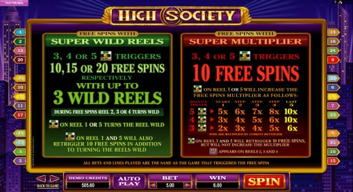 Специальные символы игрового автомата – это Wild (логотип High Society) и Free Spins (сотенные купюры евро). Они обладают особыми возможностями: