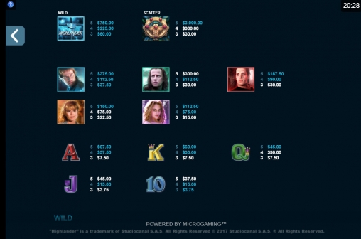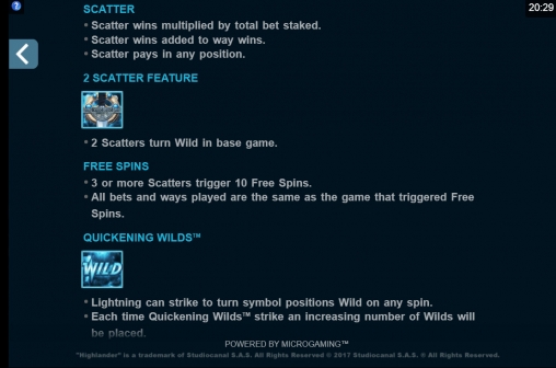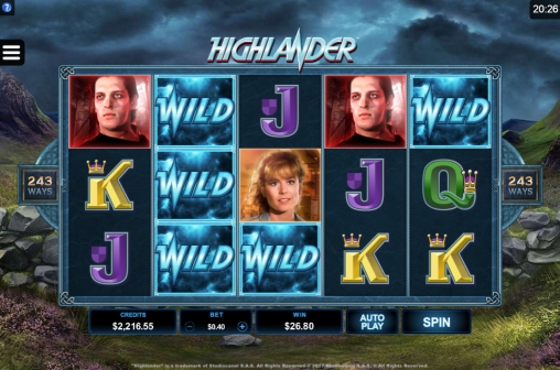 В Highlander использованы десять стандартных иконок, джокер с разновидностью Quickening Wilds, скаттерами с призовыми возможностями и фри-спинами с особыми условиями игры.