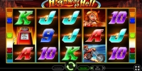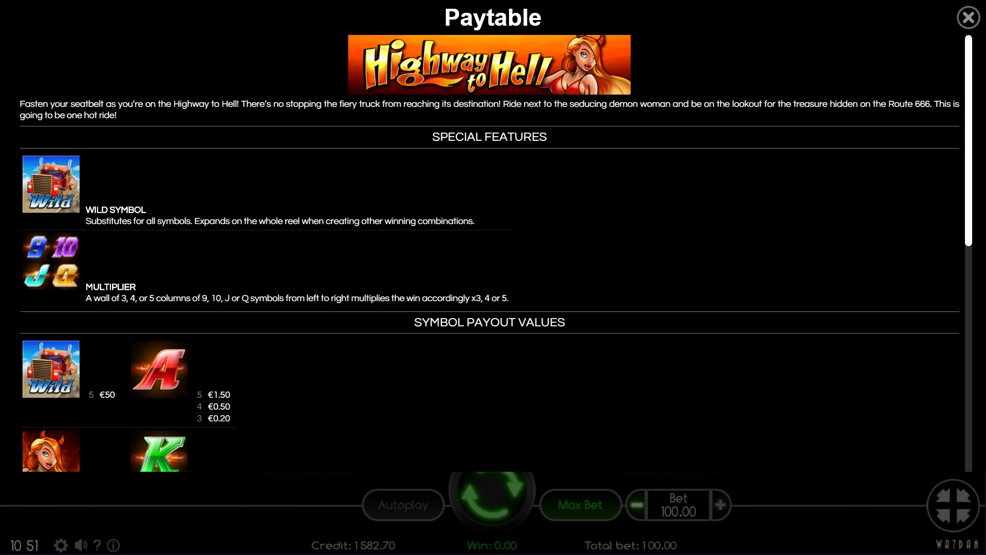 Открыв игровой аппарат Highway to Hell, вы увидите на его барабанах номиналы карт от девятки до туза, рыжую девушку с рожками на голове, эту же красавицу на мотоцикле, знак Route 666 и Speed Limit 55, а также бензиновую колонку.