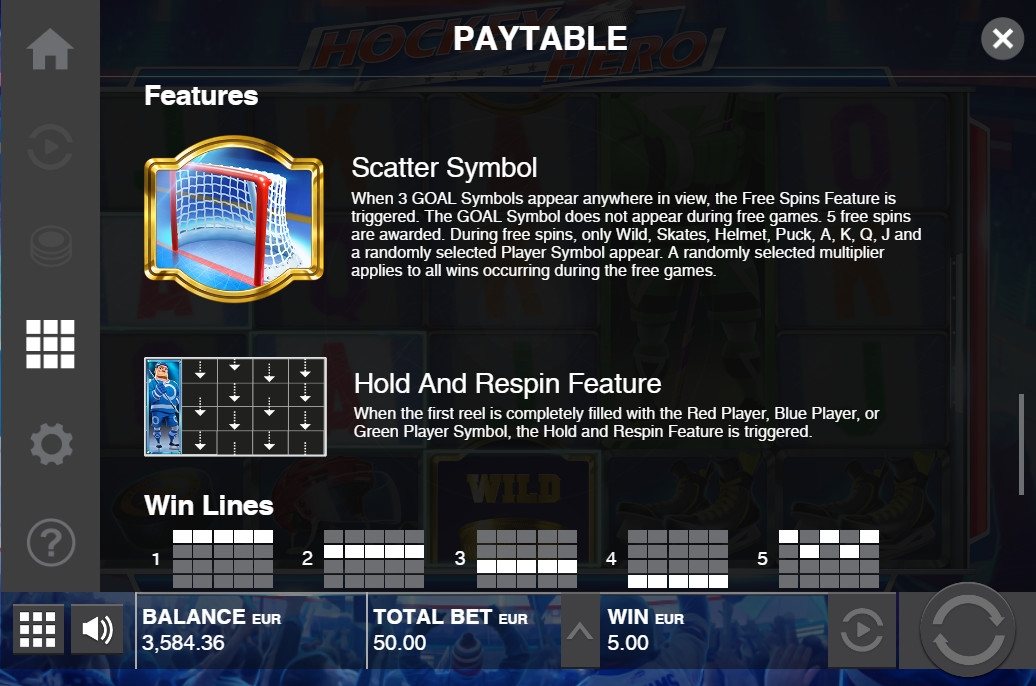 В игровом автомате Hockey Hero пять барабанов и сорок постоянно задействованных линий, на которых образуются комбинации.
