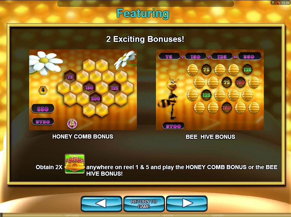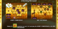 - Bonus, представляющий собой пчелиный улей, выпадает лишь на первом и пятом барабанах. Когда на экране появляются два таких символа, игрок получает право на участие в призовом раунде.