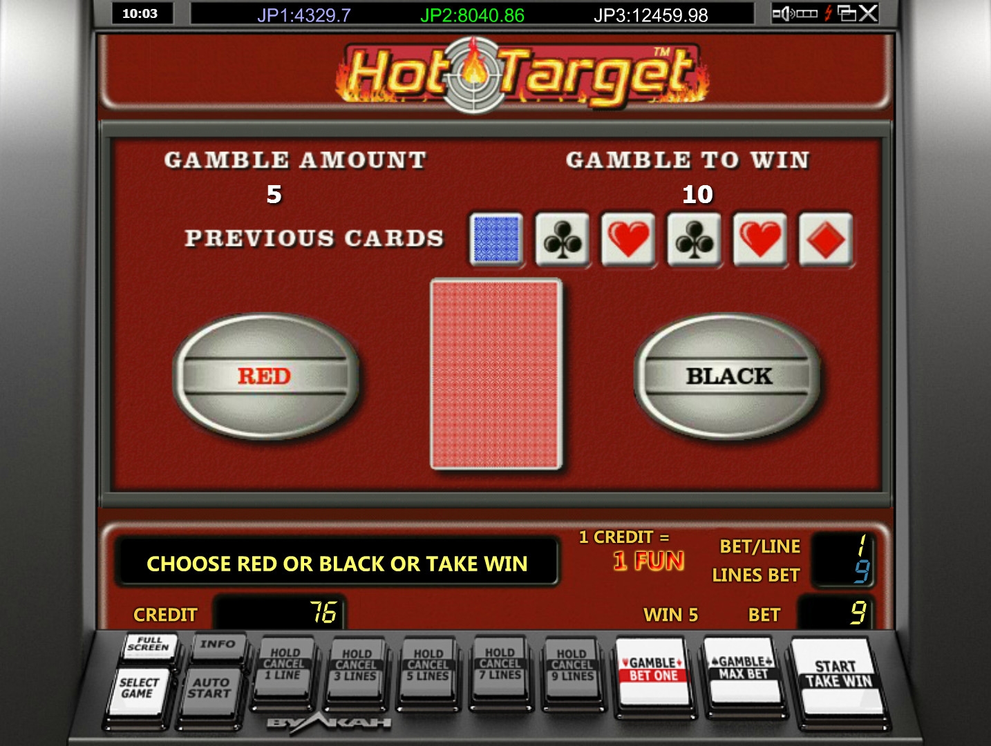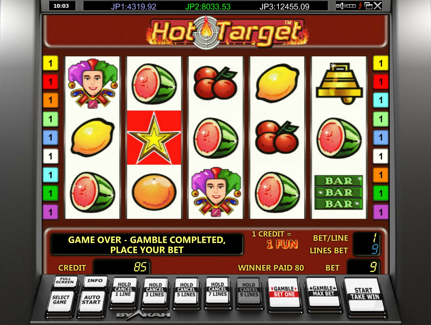 всем привет. Залипаю у монитора. Суббота. Дел нет. Hot Target представляет собой простенький игровой аппарат с пятью барабанами и девятью активными полосами - тоесть всё что нужно в нем есть но ничего более, нет изюминки я бы сказал