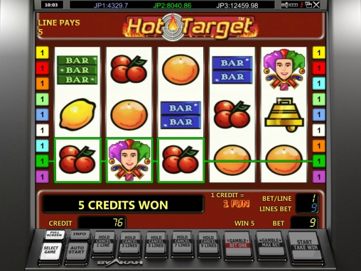 В Hot Target не осуществляется розыгрыш накопительного джекпота от Novomatic. Но в казино на этой модели могут быть доступны внутренние единые прогрессивные суммы. Обычно такие джекпоты разыгрываются сразу во всех моделях, представленных в заведении.