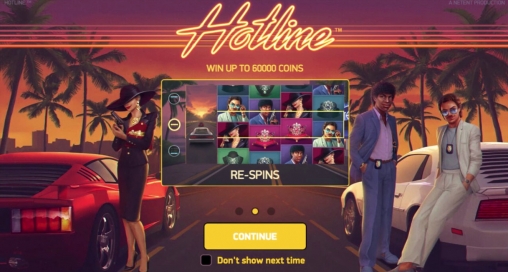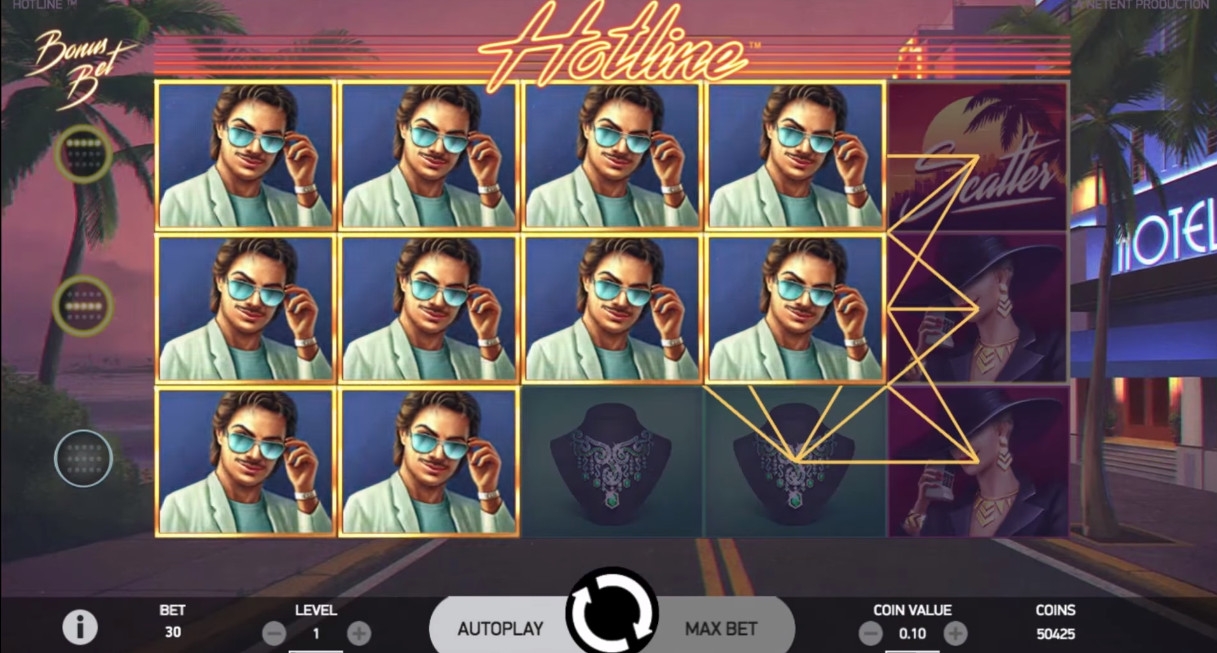 Компания NetEnt выпустила игровой автомат Hotline, стилизованные под телесериалы девяностых годов. Он перенесет вас в Майями конца двадцатого века, где вашими спутниками будут колоритные персонажи с огромными сотовыми телефонами и блестящими пистолетами. Судя по всему, они намереваются ограбить ювелирный салон, где представлены роскошные украшения.