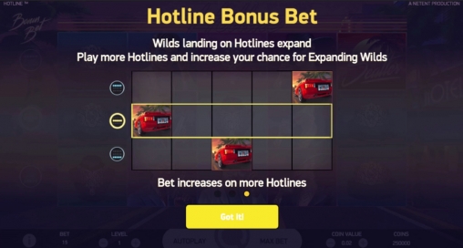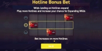 Играть на автомате Hotline можно лишь по тридцати полосам. На линию принимается от полцента до пяти долларов в базовом режиме (0.15 – 150 долларов на спин).