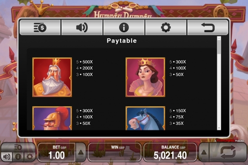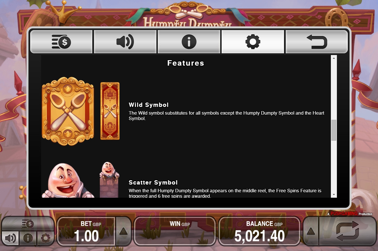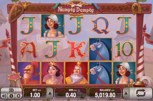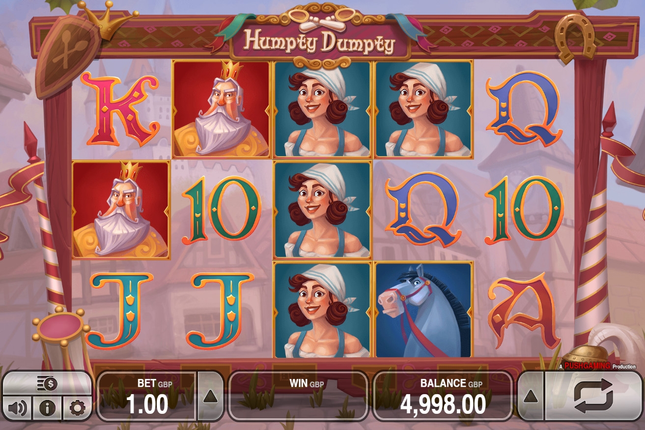 На барабанах видео-слота вы увидите не только Шалтая-Болтая, но также короля, королеву и даже представителей конницы и рати, которые не смогли поднять главного героя. Кроме того, на экране появляются номиналы карт от десятки до туза.