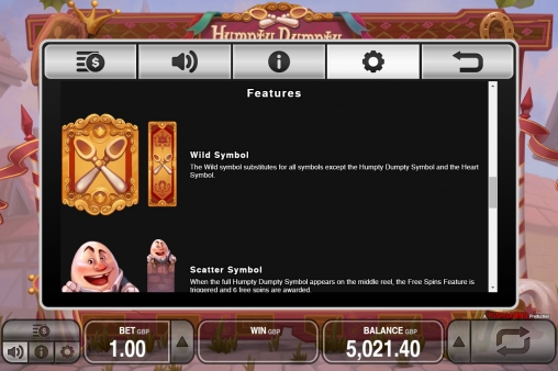 - Scatter (Шалтай-Болтай) изображен на третьем барабане. Когда он заполняет всю колонку, игрок получает право на шесть бесплатных вращений.