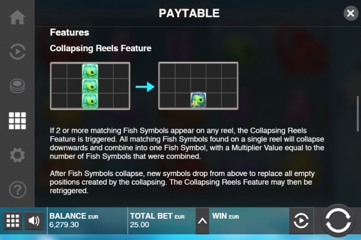 - Collapsing Reels – Если два или три одинаковых символа появляются в колонке вертикальным стеком, они обрушиваются, превращаясь в одну картинку. На ней отображается множитель, соответствующий количеству элементов, которые составили эту иконку. Коэффициент учитывается при расчете выплат. В освободившихся ячейках появляются новые предметы.