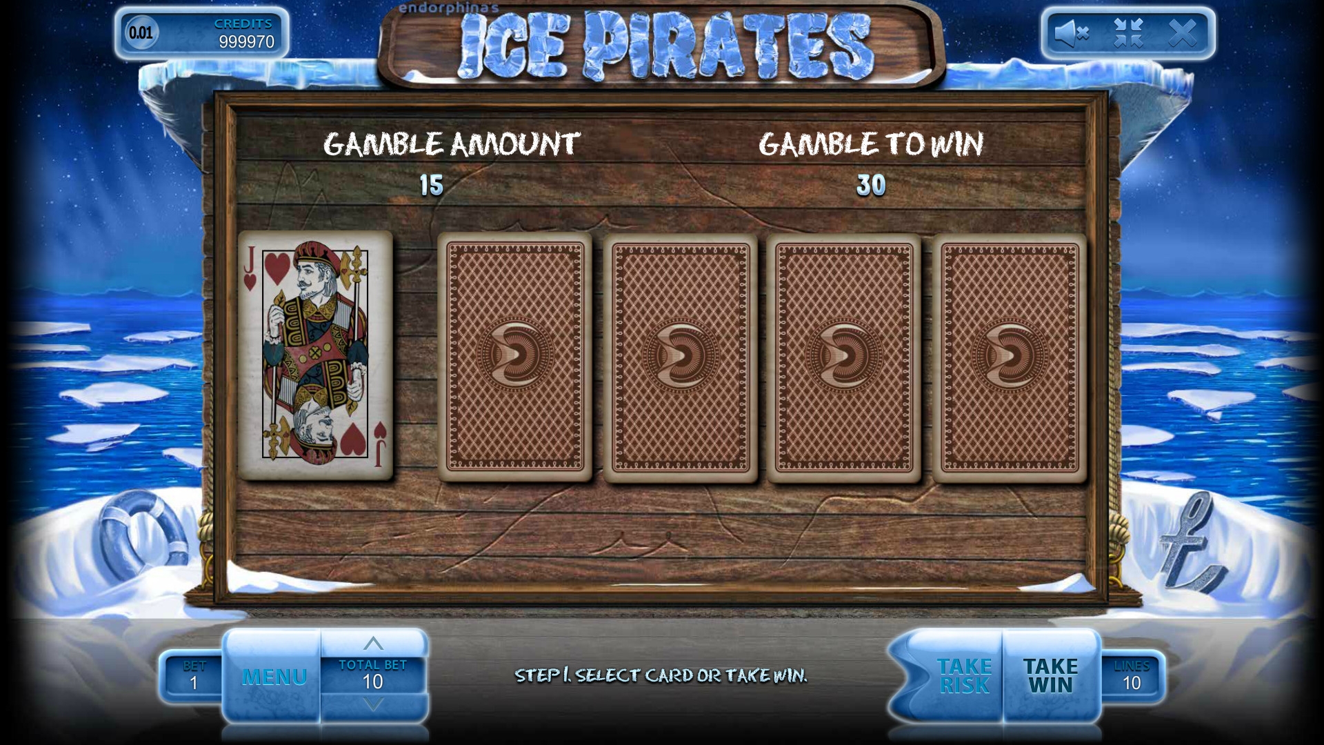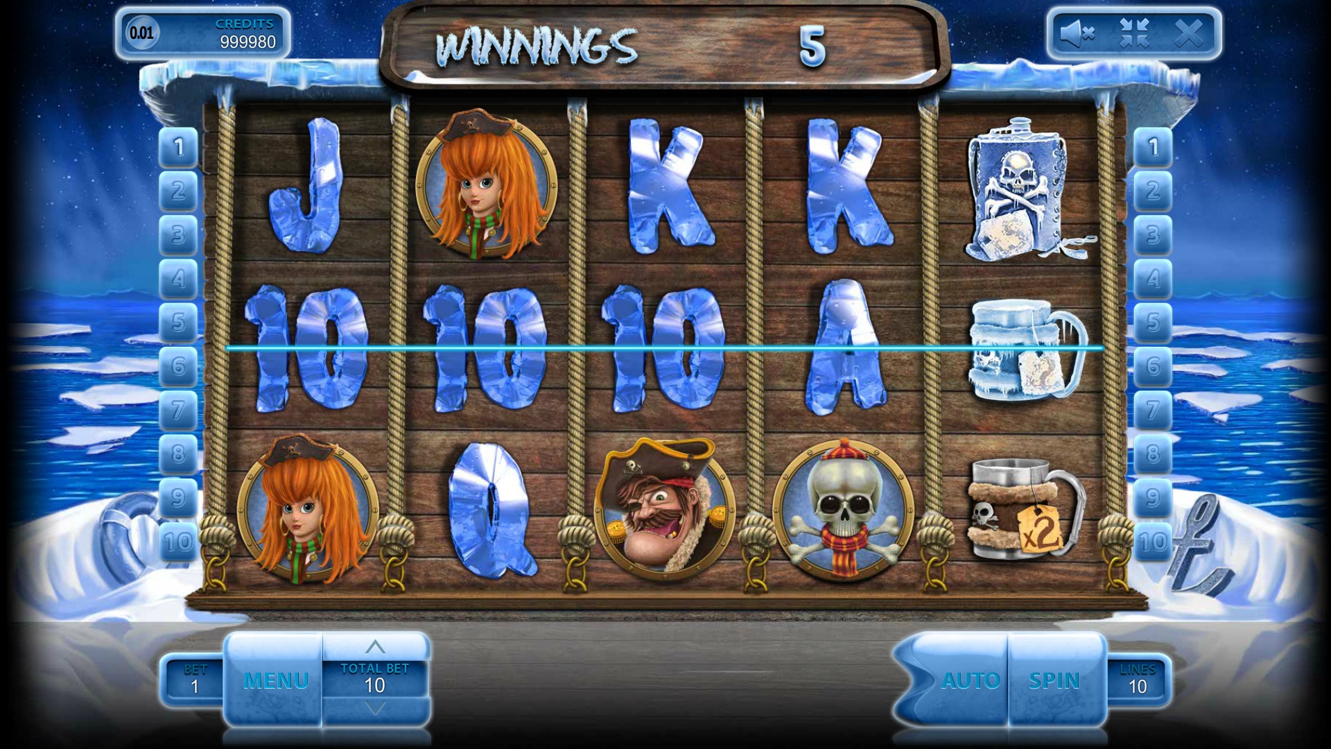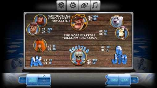 Сначала рассмотрим картинки с первых четырех колонок. На экране видео-слота вы увидите членов команды пиратов: рыжебородого боцмана, старого морского волка, девушку с огненными волосами, белого медведя и пингвина с саблей. Кроме того, на барабанах изображены вырезанные изо льда номиналы карт от десятки до туза.