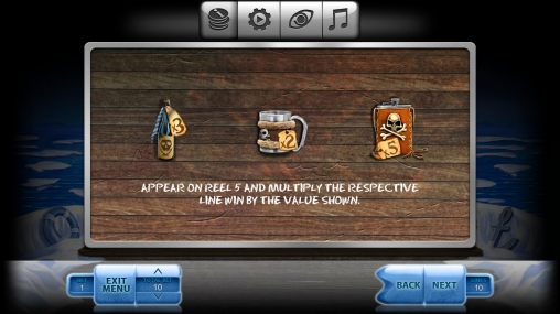 На пятом барабане изображены следующие предметы: бутылка рома, кружка и фляга. На них есть бирки с указанием множителя. Он учитывается при начислении выплаты по комбинации, если оказывается на данной линии.