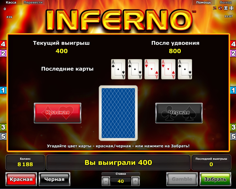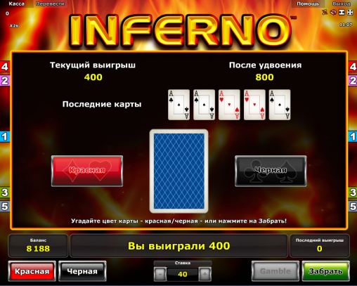 Так как интерфейс «Инферно» полностью переведен на русский язык, включая надписи на панели, таблицу выплаты, диалоговые окна и справочный раздел, объяснять вам, что они означают, нет необходимости.