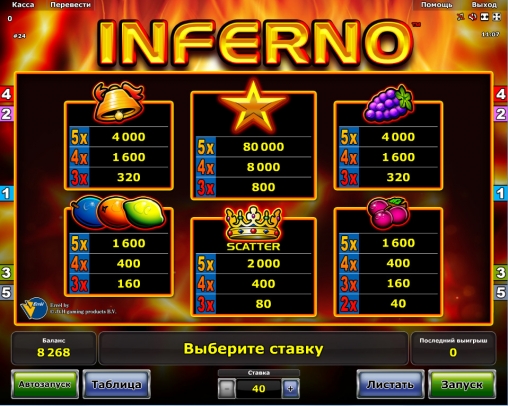 Но слот-машина Inferno обладает своими достоинствами, в числе которых довольно высокие выплаты, широкий диапазон ставок, полный перевод на русский и отсутствие необходимости скачивать программное обеспечение.