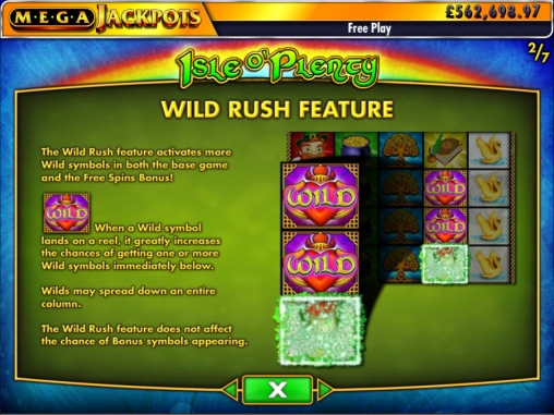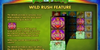 - Wild может заменять простые картинки в комбинациях. Кроме того, появляясь на экране, он активирует функцию Wild Rush. Она означает, что элементы под данным символом могут превратиться в Wild. Соответственно, образуются аналоги вертикальных цепочек (стекированные картинки), что значительно повышает вероятность образования многочисленных комбинаций.