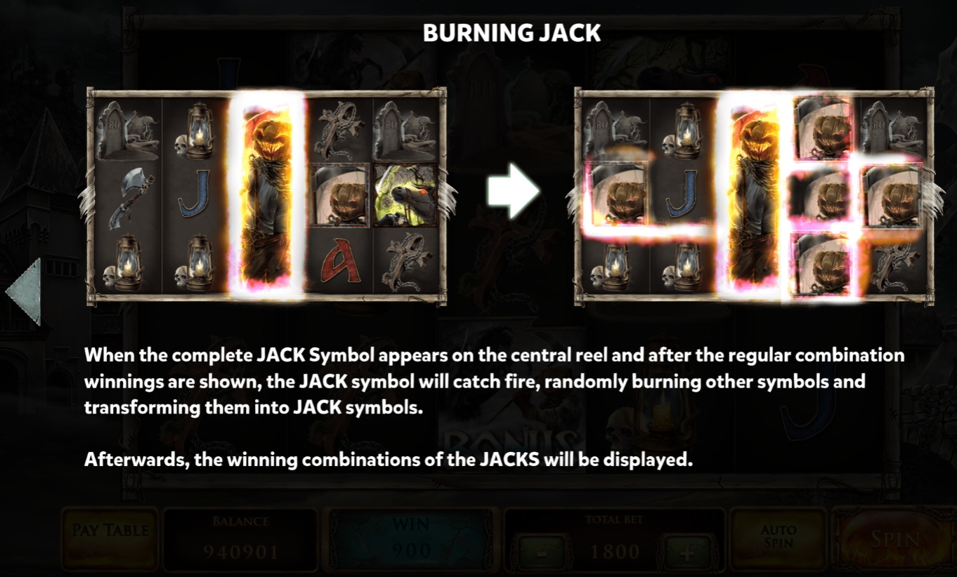 - Burning Jack – Джек-светильник загорается и начинает разбрасывать языки пламени. Они поджигают другие символы, также превращая их в Джеков.
