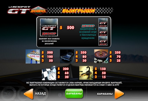 В числе функций видео-слота особые символы, тематические бонусные раунды, бесплатные запуски, прогрессивный джек-пот и другие. Рискованной игры по шансам в Jackpot GT: Race to Vegas нет, поэтому все выплаты, полученные за спин, сразу оказываются на счету пользователя.