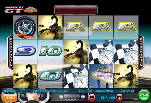 На барабанах видео-слота Jackpot GT: Race to Vegas изображен черный автомобиль, вывеска Лас-Вегаса, рулетка, секундомер, скорпион, а также буквы и цифры, обозначающие игральные карты от девятки до туза.
