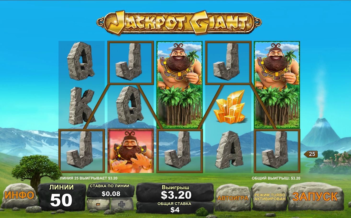Jackpot Giant – бесплатный игровой автомат с пятью барабанами, пятьюдесятью линиями и тремя рядами картинок на экране. Задействовать можно лишь все активные полосы сразу. Менять их количество не разрешается. Ставки по всем позициям одинаковы. Они могут быть от одного цента до восьми центов в Winner Casino (до четырех долларов на спин), хотя в других заведениях диапазон может отличаться.