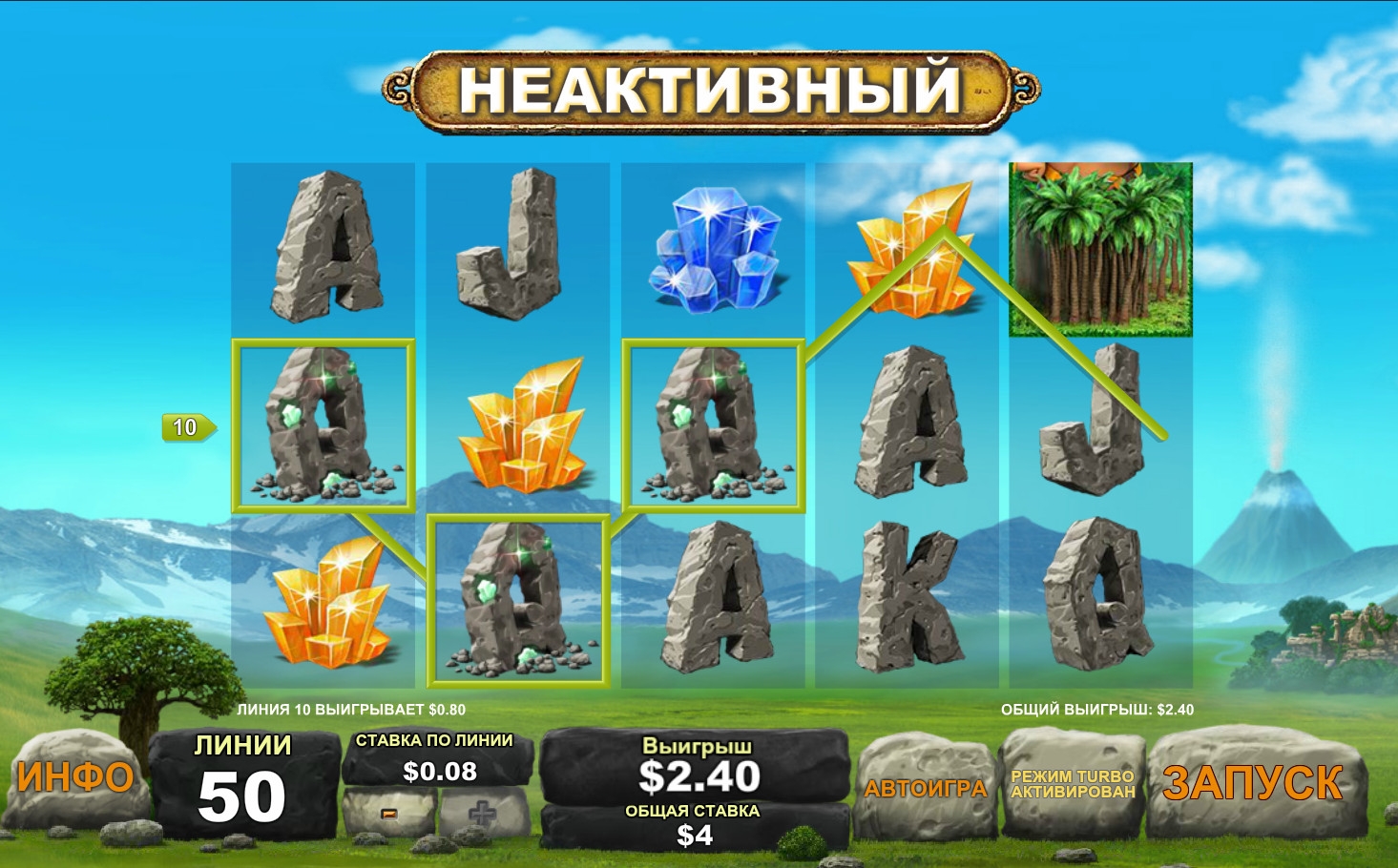 Автоматы в 50 игровых линий встречаются редко, хотя мне они очень нравяться. А у этого слота еще и довольно не обычное оформление, барабаны чисто прозрачные. Бонусная игра хоть и совсем простая, но иногда вулканы выплёвывали мне мощные умножения, поднимал не плохо.