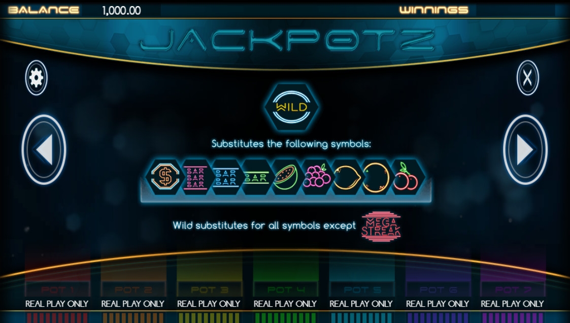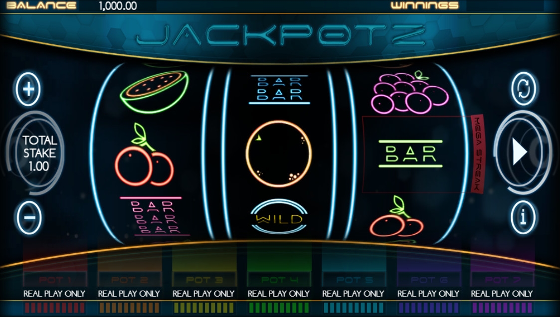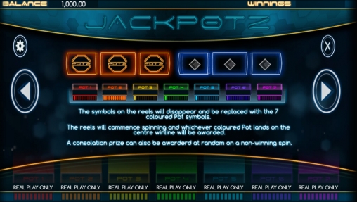 - Jackpotz - Под барабанами находятся семь индикаторов. Они заполняются по мере увеличения сумм. В ходе игры мигают буквы на логотипе слот-машины. Если вся надпись будет подсвечена, запустится специальный раунд. Вместо колонок появятся символы прогрессивных джекпотов. Затем начнут вращаться барабаны. Знак, который окажется на центральной линии, определит, стал ли игрок победителем. Помимо джекпотов, разыгрываются утешительные призы.