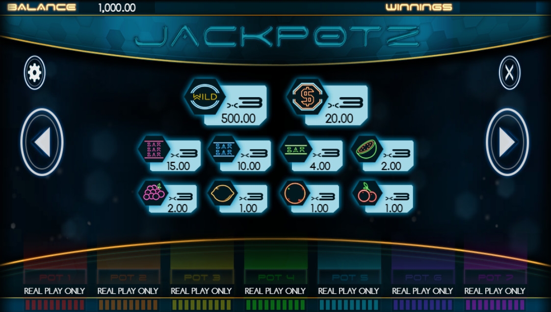В Jackpotz три барабана и пять неизменно используемых линий, необходимых для формирования комбинаций. Ставка на одну полосу варьируется в диапазоне от четырех центов до двух долларов (0.20 – 10 долларов на раунд).