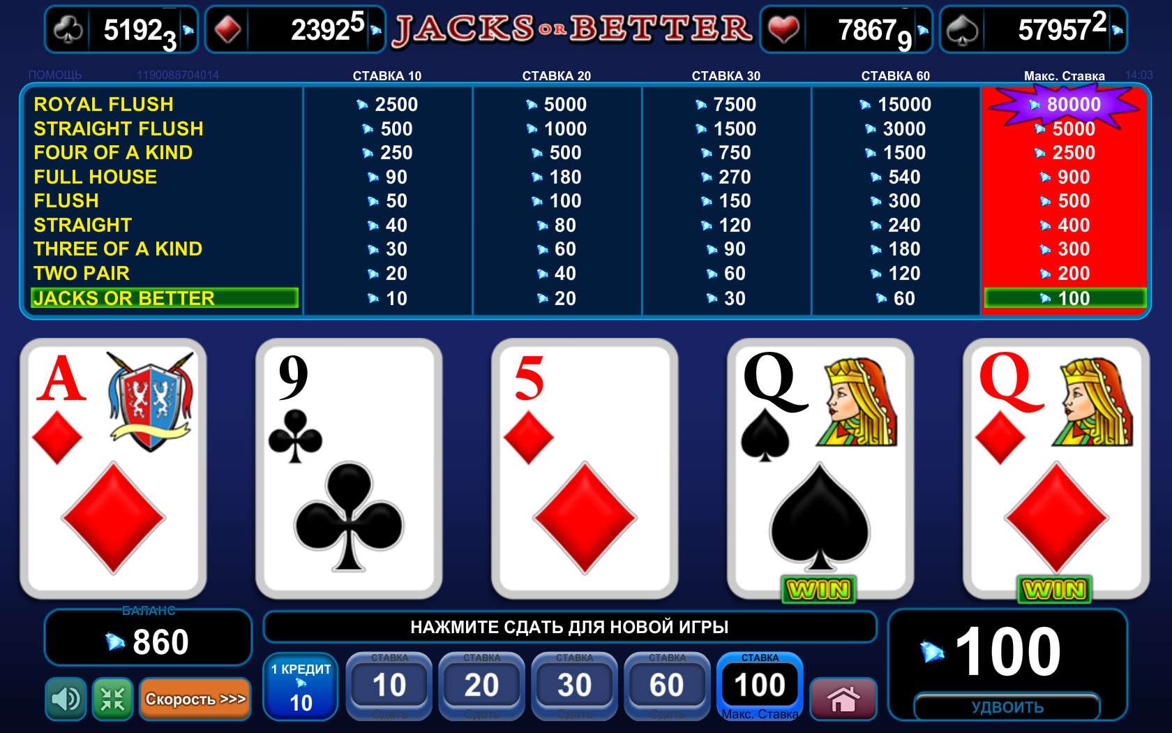 Играть в видео-покер «Валеты или выше» от EGT разрешается, поставив на раунд десять, двадцать, тридцать, шестьдесят или сто монет. Если делать максимальную ставку, непропорционально увеличивается выплата за роял флеш. Соответственно, рекомендуется всегда ставить наибольшую ставку (если вам это по карману).
