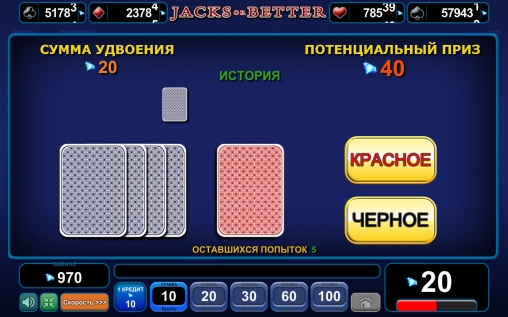 Затем клиент принимает решение, стоит ли ему участвовать в игре по шансам, в которой можно попытаться значительно увеличить выплату. В ней нужно угадывать цвет закрытой карты. Правильный ответ означает удвоение суммы. Неправильный приводит к проигрышу ставки. Можно подряд играть несколько раз, но нельзя превышать установленный максимум.