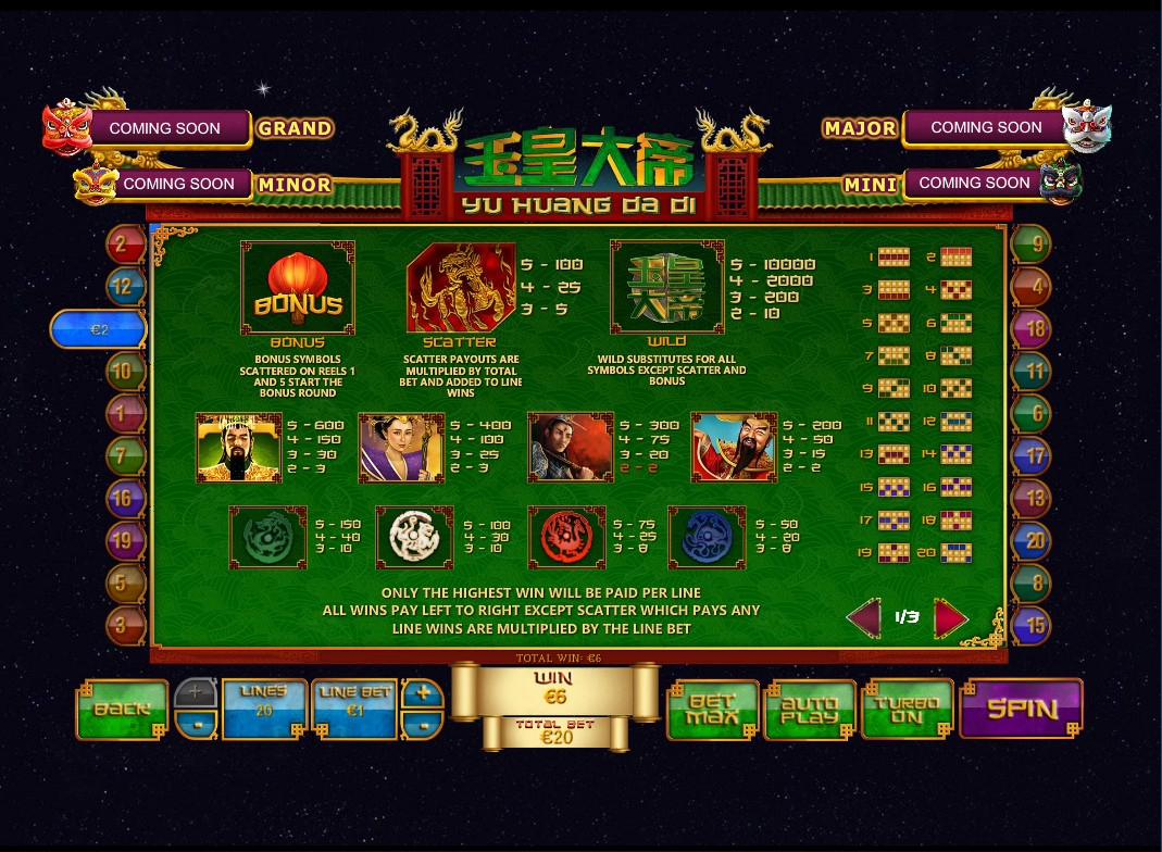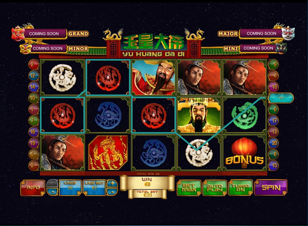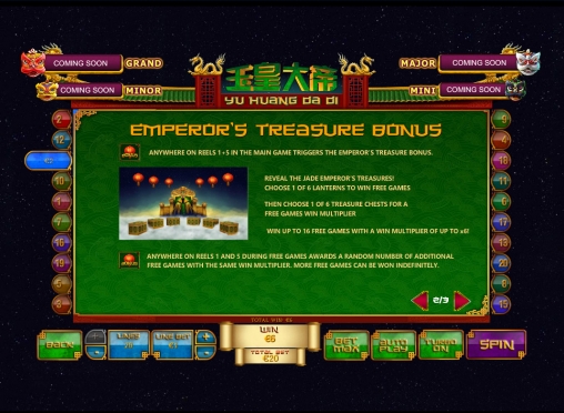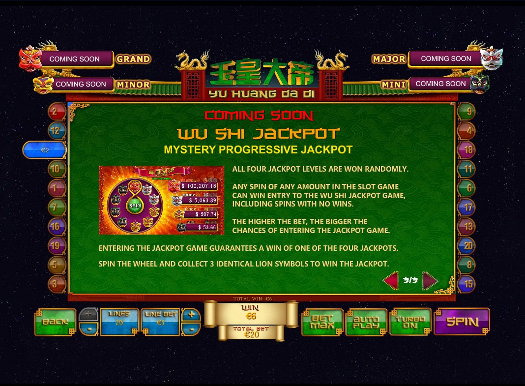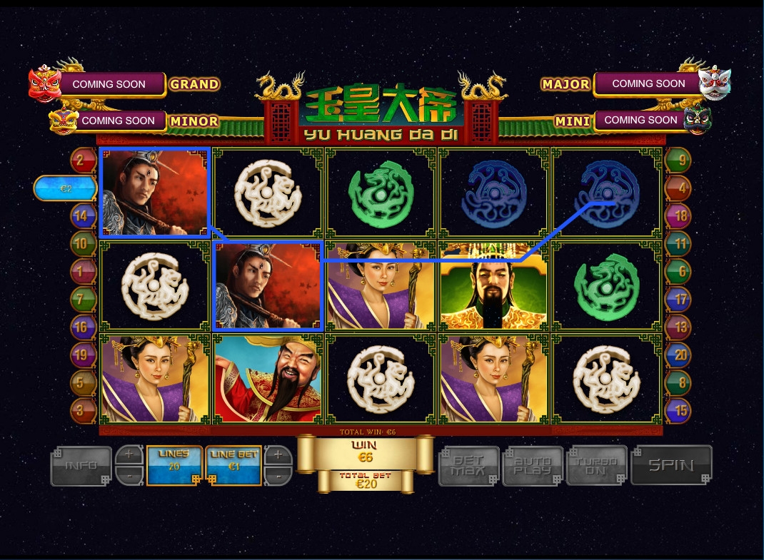 «Нефритовый император» имеет пять барабанов и двадцать активных линий, на которые можно делать равные ставки. Количество полос можно менять. На каждую линию принимается от одного цента до двадцати пяти евро. Выходит, что на раунд можно ставить не менее одного цента и не более пятисот евро (в Europa casino).