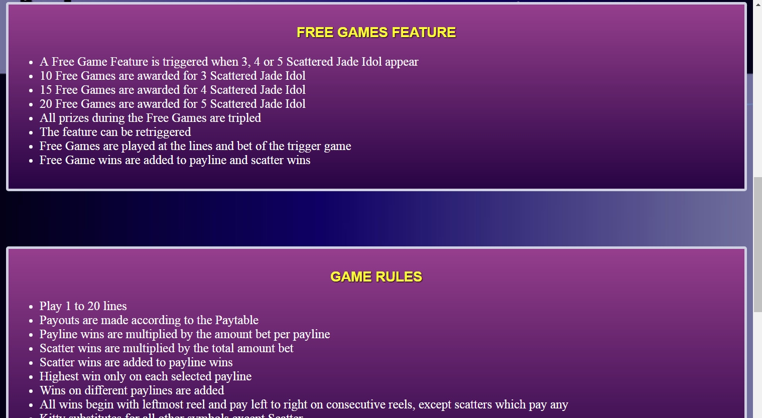 - Scatter (нефритовая статуэтка) изображена на всех барабанах. Три, четыре или пять скаттеров запускают бесплатные вращения.