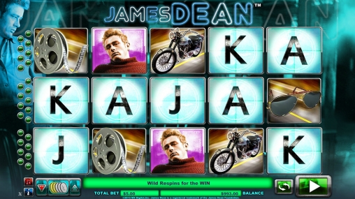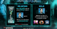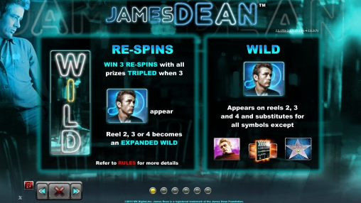 - Wild (Джеймс Дин на голубом фоне) представлен на втором, третьем и четвертом барабанах. По этой причине сам по себе он оплачиваться не может, но способен заменять другие картинки в цепочках (речь только о базовых символах). Три Wild на экране дают право на участие в трех бесплатных респинах. В них Wild становятся расширяющимися и заполняют всю колонку, когда появляются в любой ячейке.