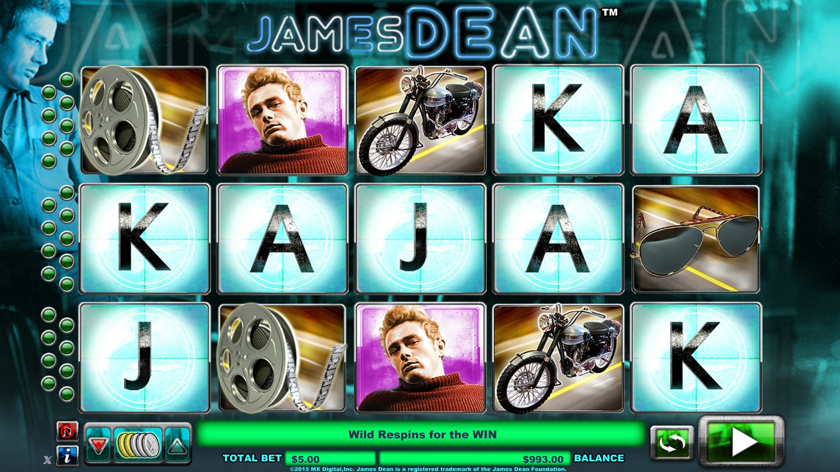 «Джеймс Дин» является 5-барабанным игровым автоматом с пятнадцатью картинками, выстраивающимися в три ряда. Играть на видео-слоте можно исключительно по двадцати пяти линиям, на которых в процессе образуются оплачиваемые комбинации.