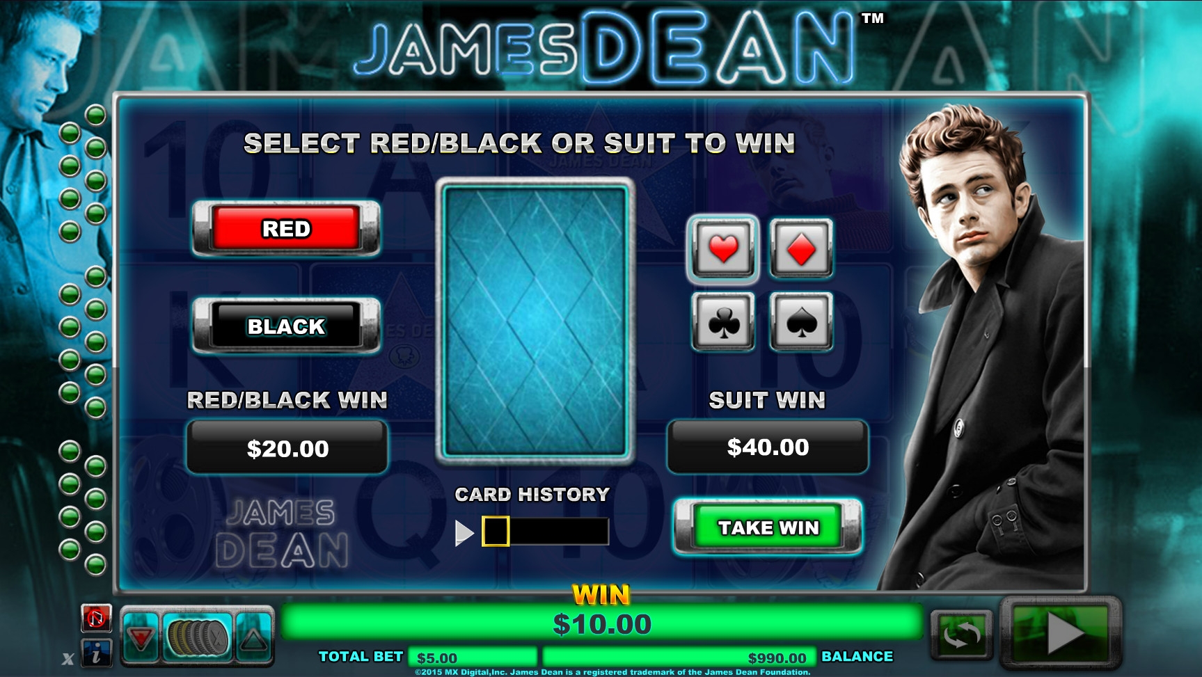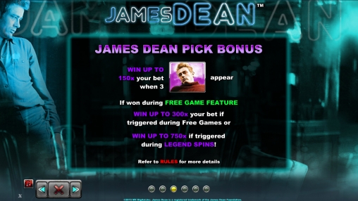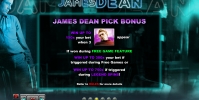 В James Dean доступны простые картинки, действующие по стандартным правилам, элементы со специальными возможностями, бесплатные респины с утроенными коэффициентами, фри-спины с расширенными функциями, бонусный раунд, риск-игра по равным шансам и другими опции.
