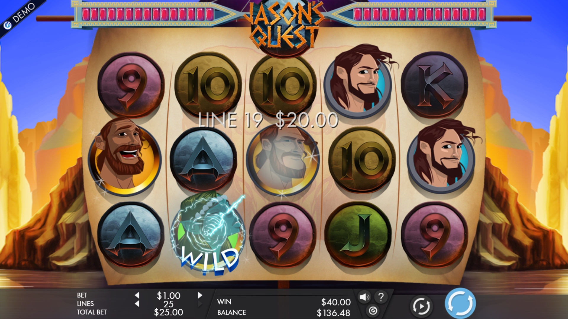 На одну линию можно ставить от цента до десяти евро. Так что на спин принимается до двухсот пятидесяти евро. Но лучше уточняйте диапазон допустимых ставок в интернет-казино, где вы будете играть в Jason’s Quest.