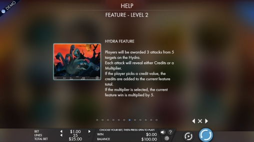 - Hydra - Эта игра доступна со второго уровня. Ясон будет трижды атаковать гидру, отрубая чудовищу головы. Удачные попытки приносят выплаты или дополнительные множители. На третьем этапе количество ударов, выигрыши и мультипликаторы увеличиваются.